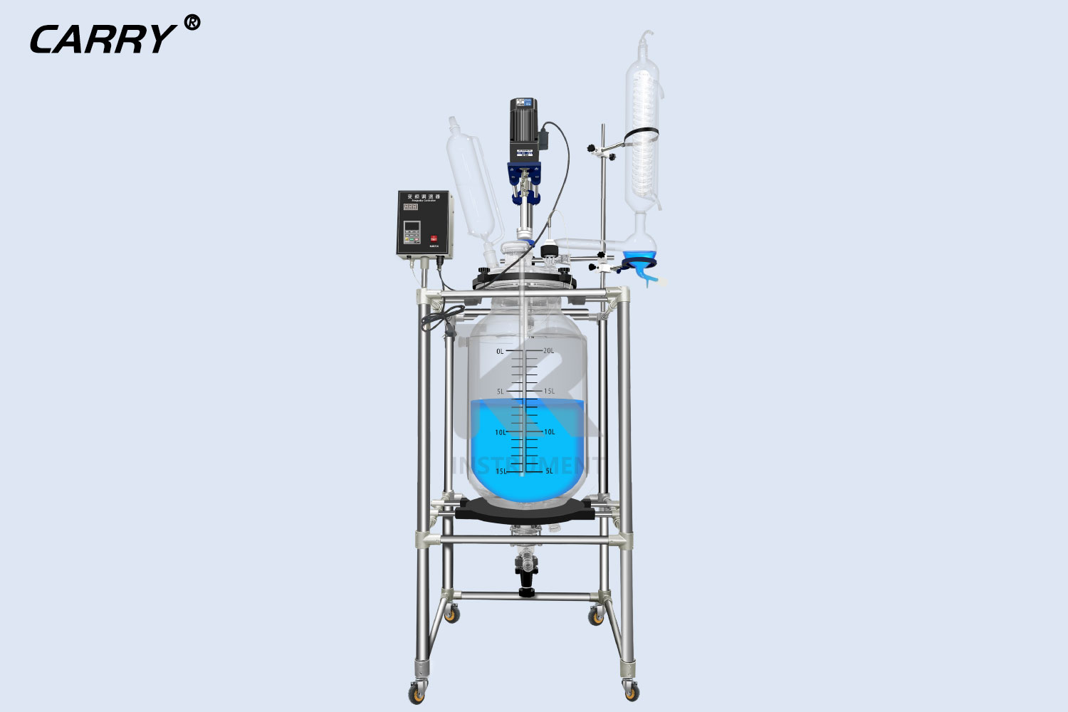 50L雙層玻璃反應釜具有電動恒速攪拌系統(tǒng)、冷凝、滴加系統(tǒng),釜體夾層需外接...